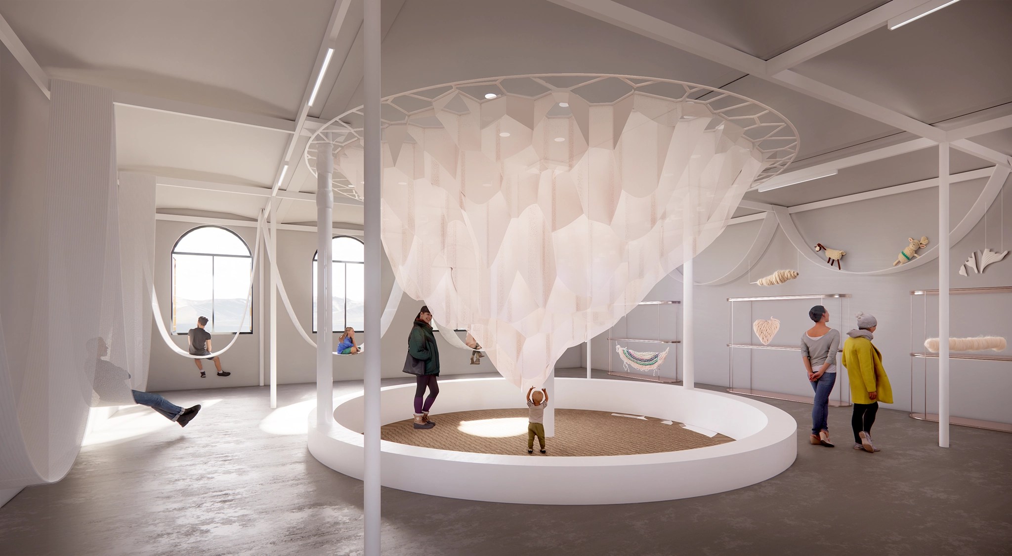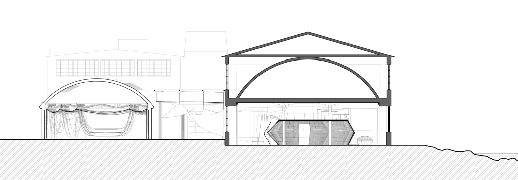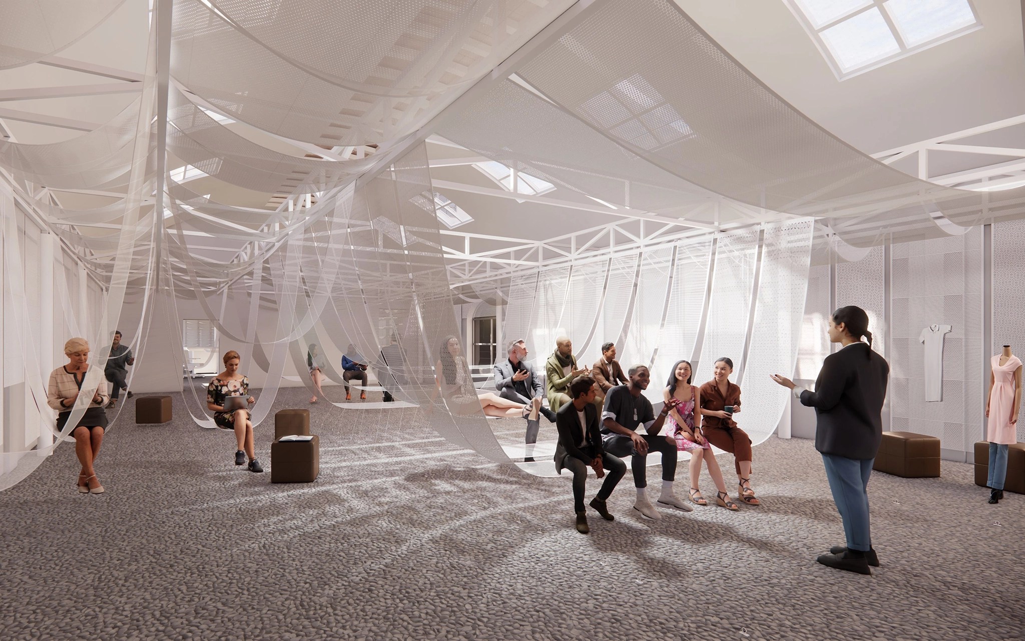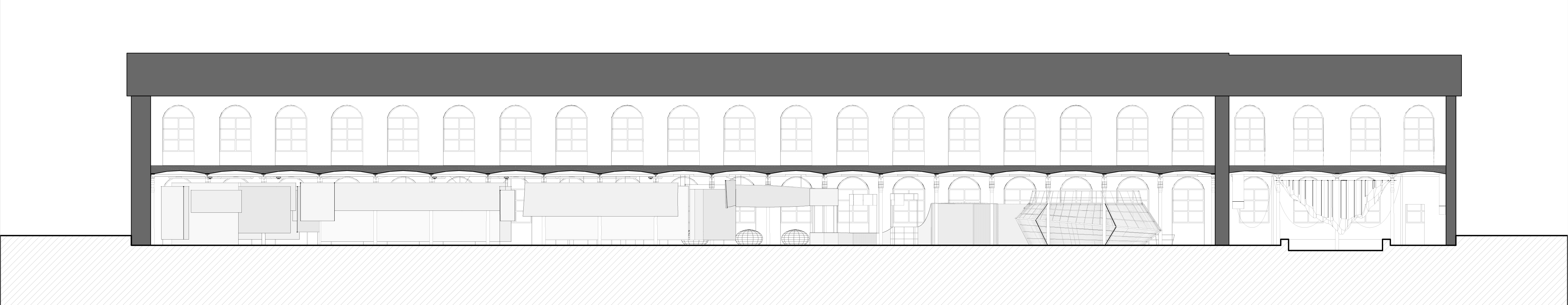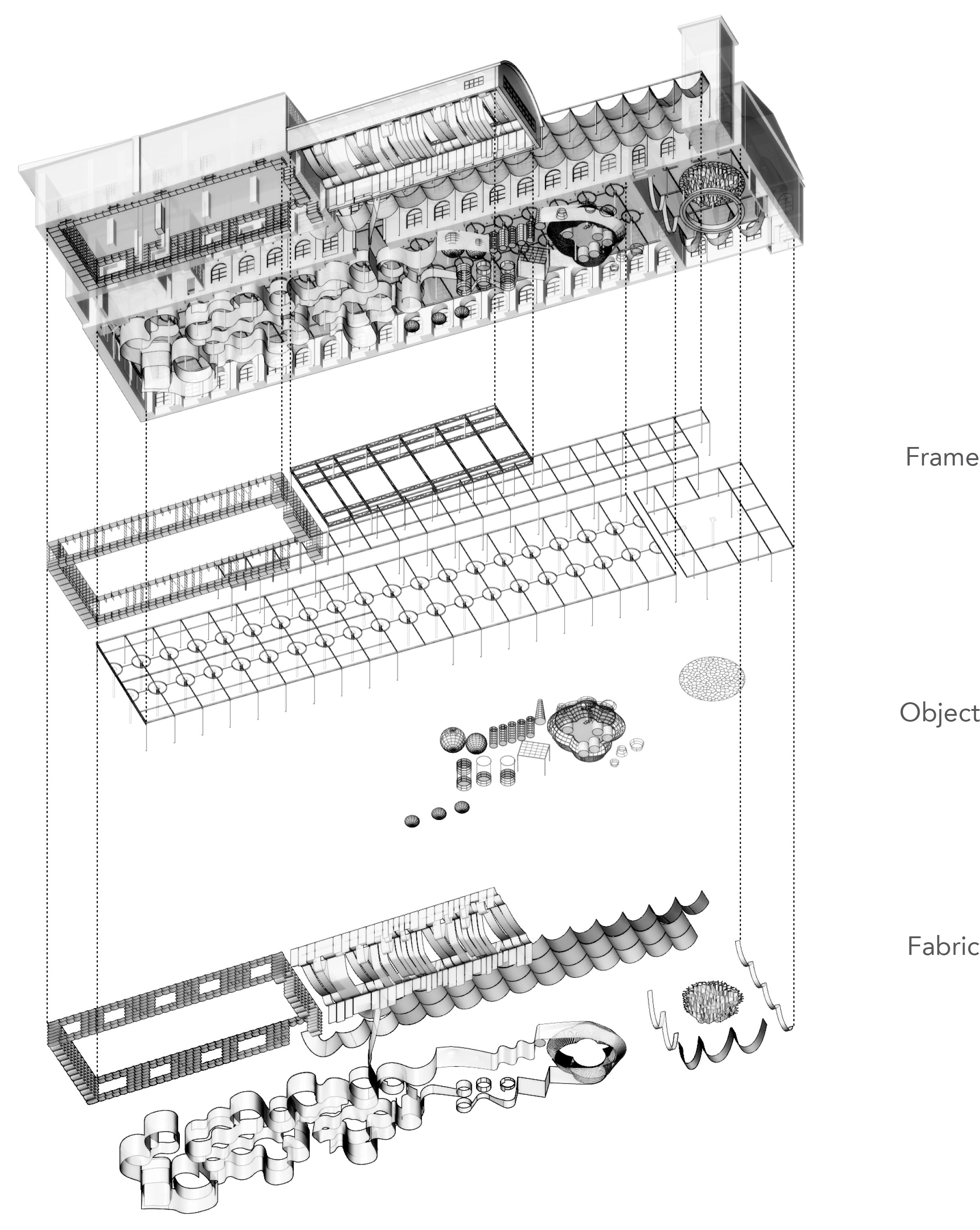 Through meticulous armature interventions, fabric materials are transfigured into an interior architectural system tailored to accommodate specific programs and activities. The cohesiveness of the framework systems ensures a seamless yet dynamic transition of fabrics across various spaces of exhibition, conference, workshop, fostering clear circulations, expressive public gestures, and the collection of diverse educational experiences.