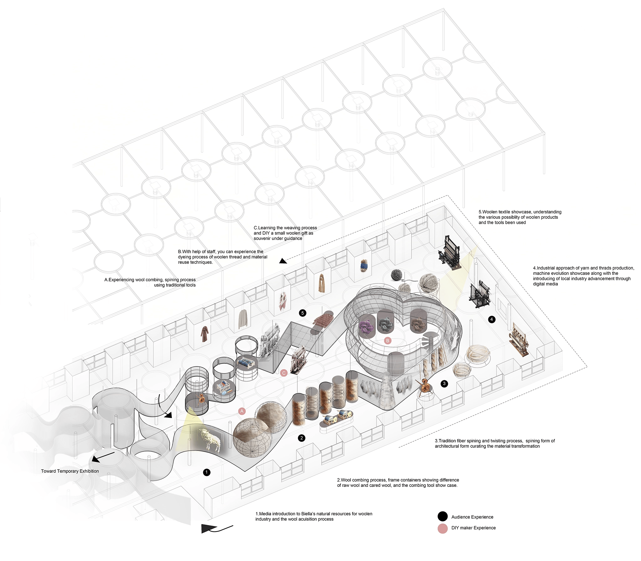 This project draws inspiration from the intricate transformations of wool materials inherent in fashion production processes. It exemplifies the potential of soft fabrics, ubiquitous in the realm of fashion, to metamorphose into diverse spatial experiences through architectural intervention. Positioned as the central hub of fashion, the Woollen Museum serves as a beacon for such explorations.