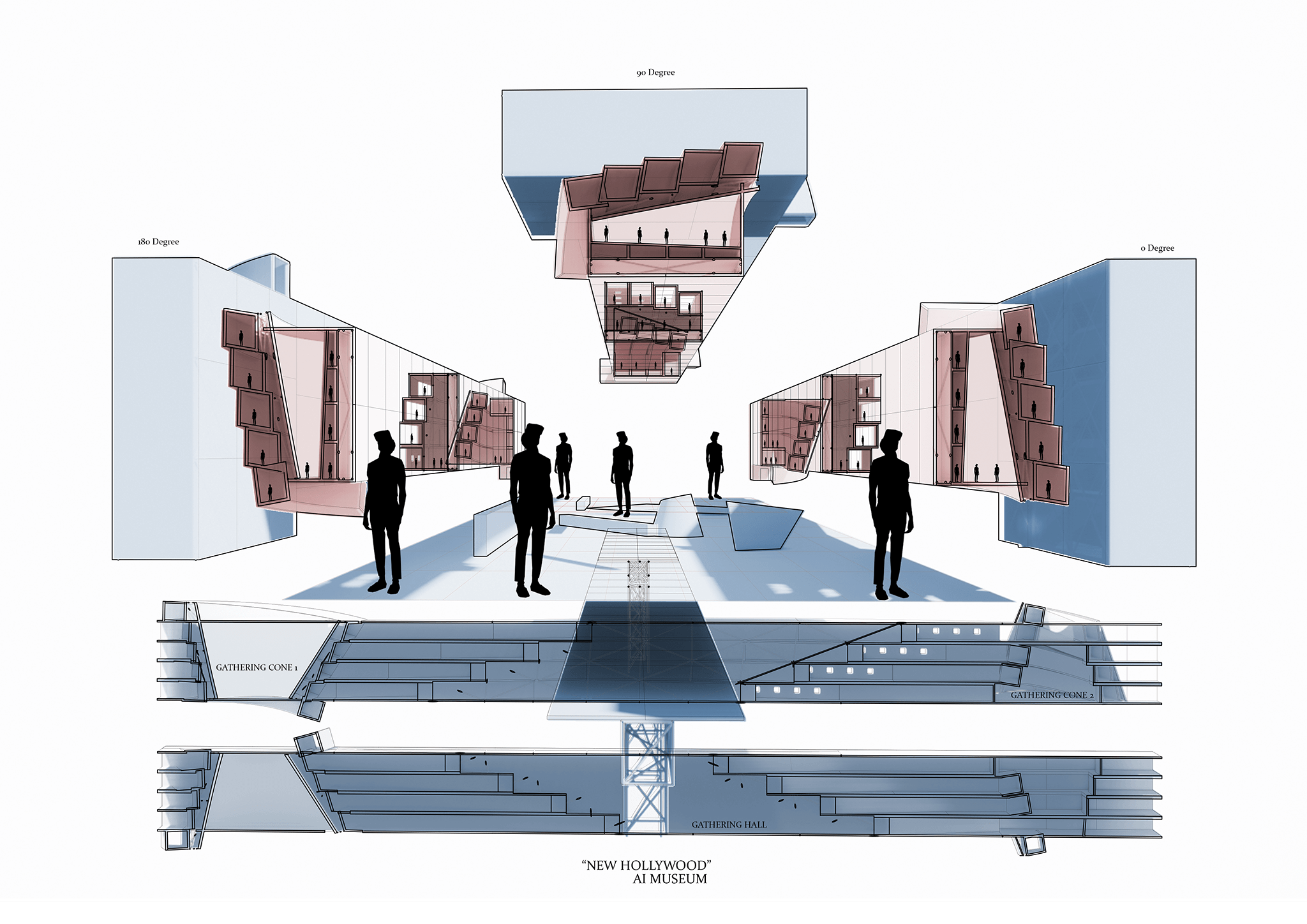 The museum features a rotating structure capable of shifting between 0, 90, and 180-degree orientations, creating a dynamic, ever-changing presence. Internally, two key spatial sequences define the design: a Linear Exhibition Space that showcases advanced digital displays, AI, AR, and VR technologies, and a Gathering Hall Space that facilitates communal interaction with public AI artworks, fostering collaboration and engagement.