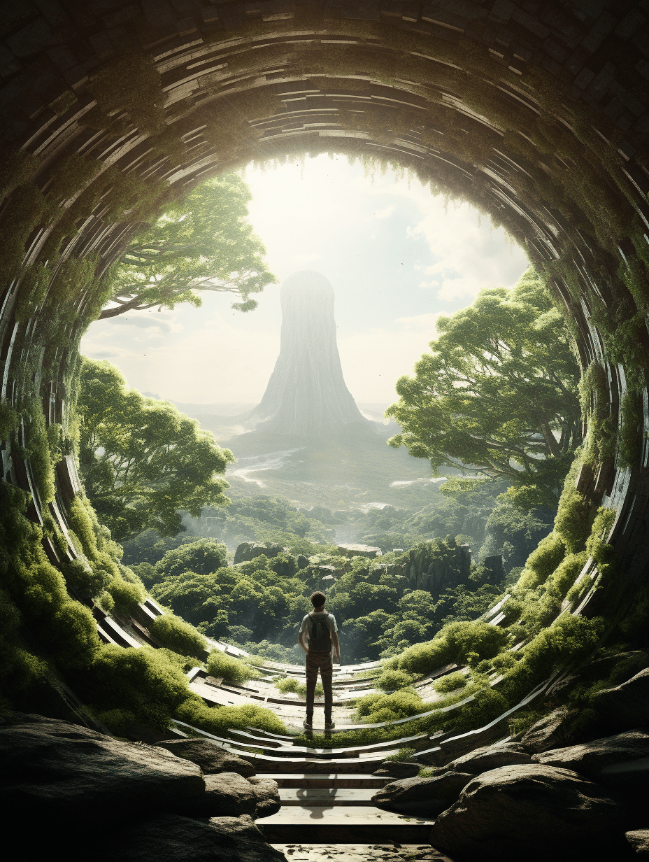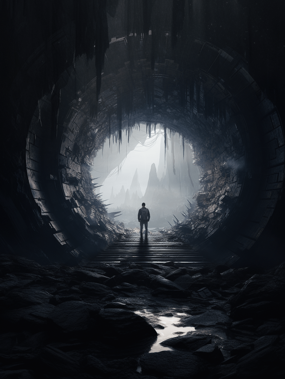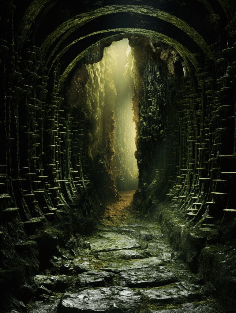 Conversely, the second path begins in an almost unbearable constriction. The entrance is narrow, the space suffocating, evoking discomfort and fear. Moss and damp stone create a sense of decay and entrapment, pressing in on the visitor from all sides. However, as one perseveres through the suffocating passage, small cues—a soft glow in the distance, a change in texture underfoot—signal a transformation. Gradually, the space opens, the light becomes warmer, and the traveler emerges into a vibrant, thriving environment. The final destination, a lush, sun-drenched haven, bursts with life—trees, birds, and flowing water all symbolizing renewal and growth.