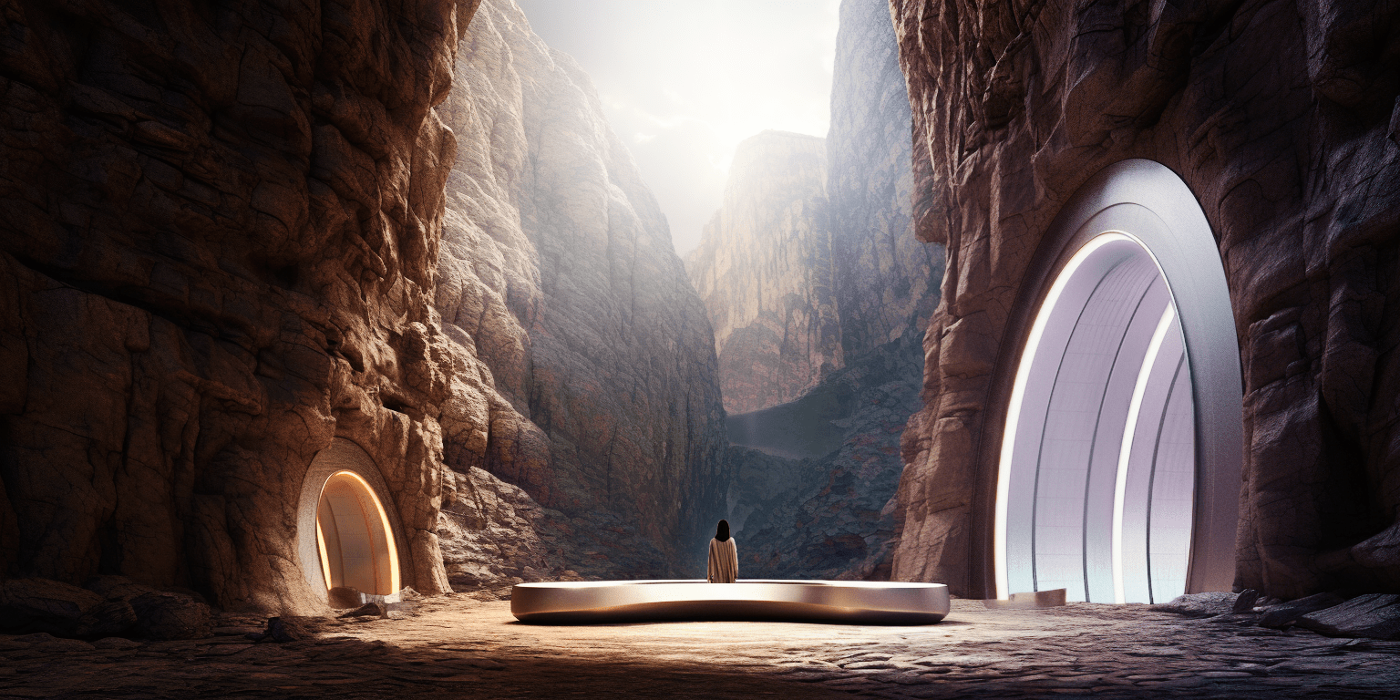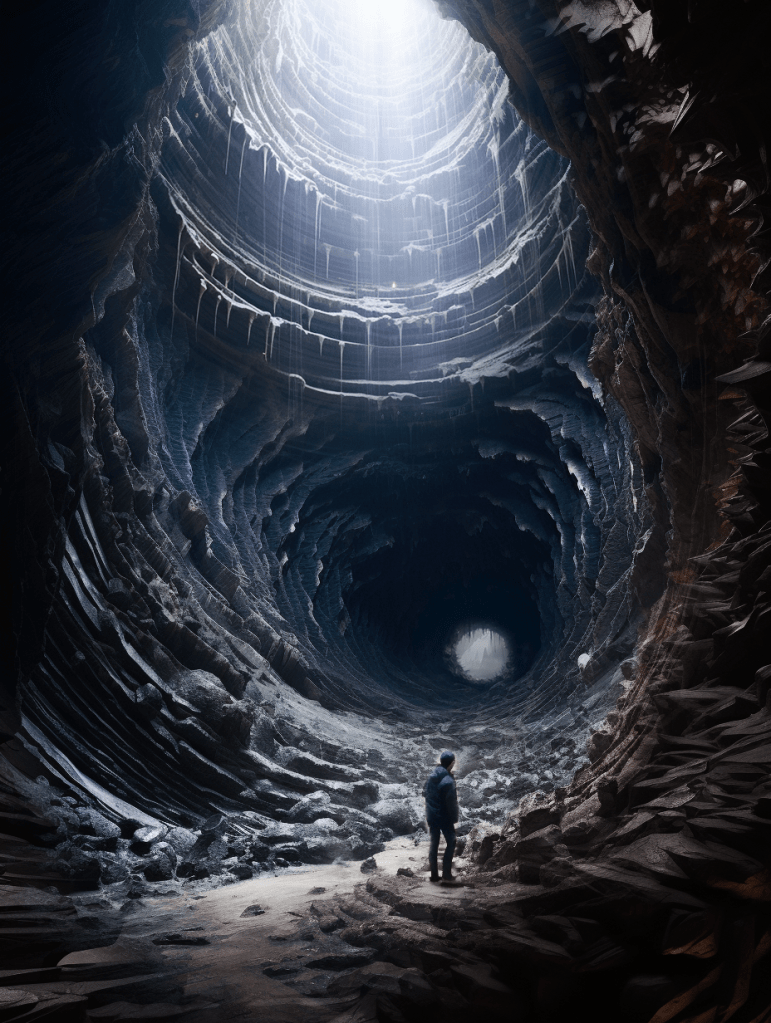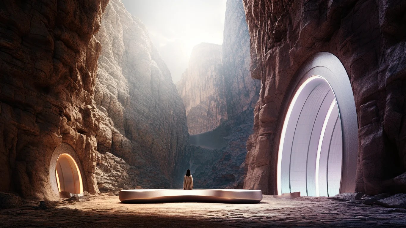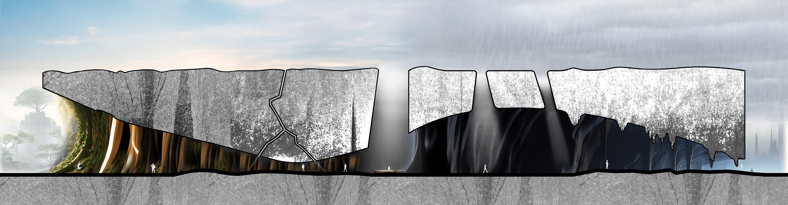 Conversely, the second path begins in an almost unbearable constriction. The entrance is narrow, the space suffocating, evoking discomfort and fear. Moss and damp stone create a sense of decay and entrapment, pressing in on the visitor from all sides. However, as one perseveres through the suffocating passage, small cues—a soft glow in the distance, a change in texture underfoot—signal a transformation. Gradually, the space opens, the light becomes warmer, and the traveler emerges into a vibrant, thriving environment. The final destination, a lush, sun-drenched haven, bursts with life—trees, birds, and flowing water all symbolizing renewal and growth.