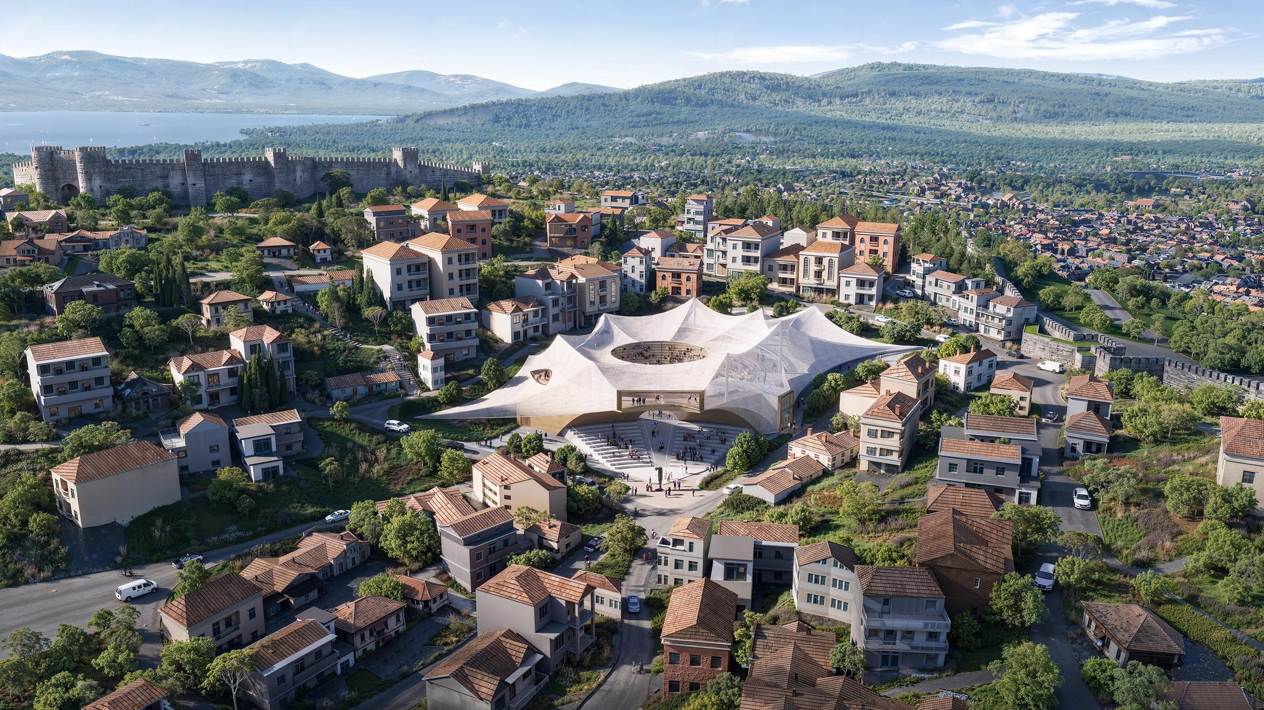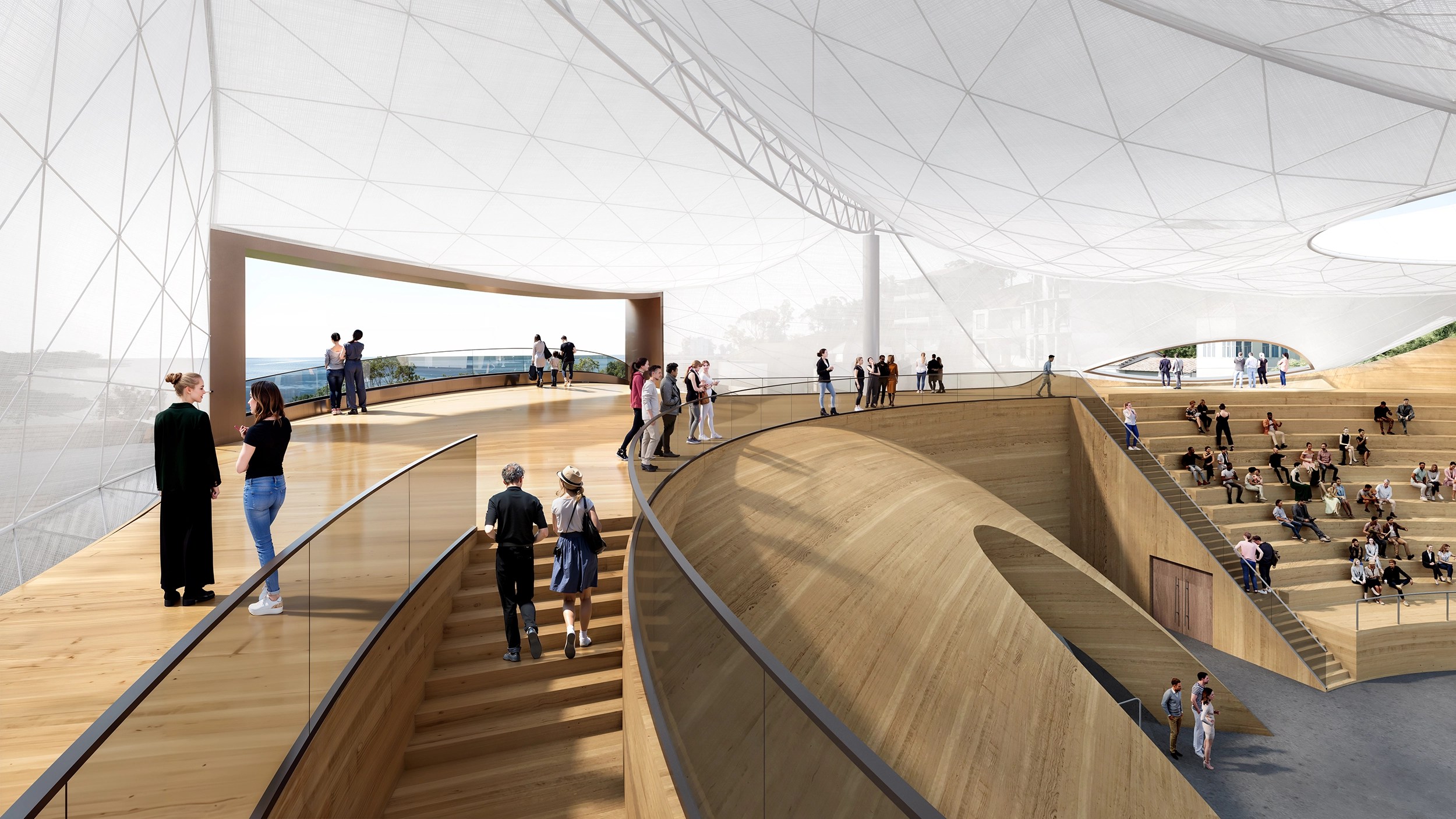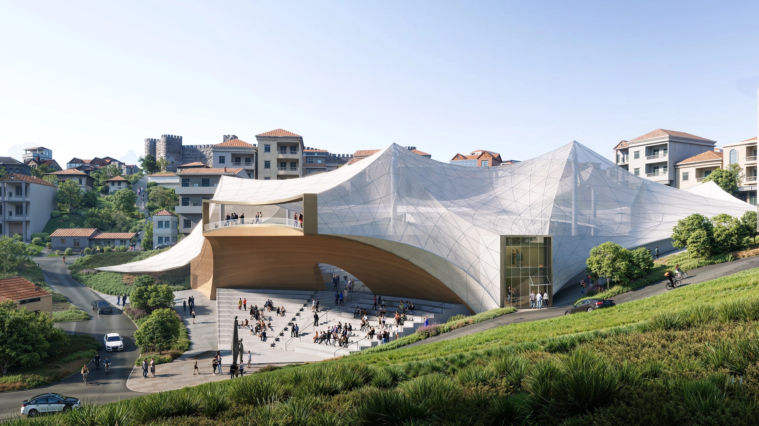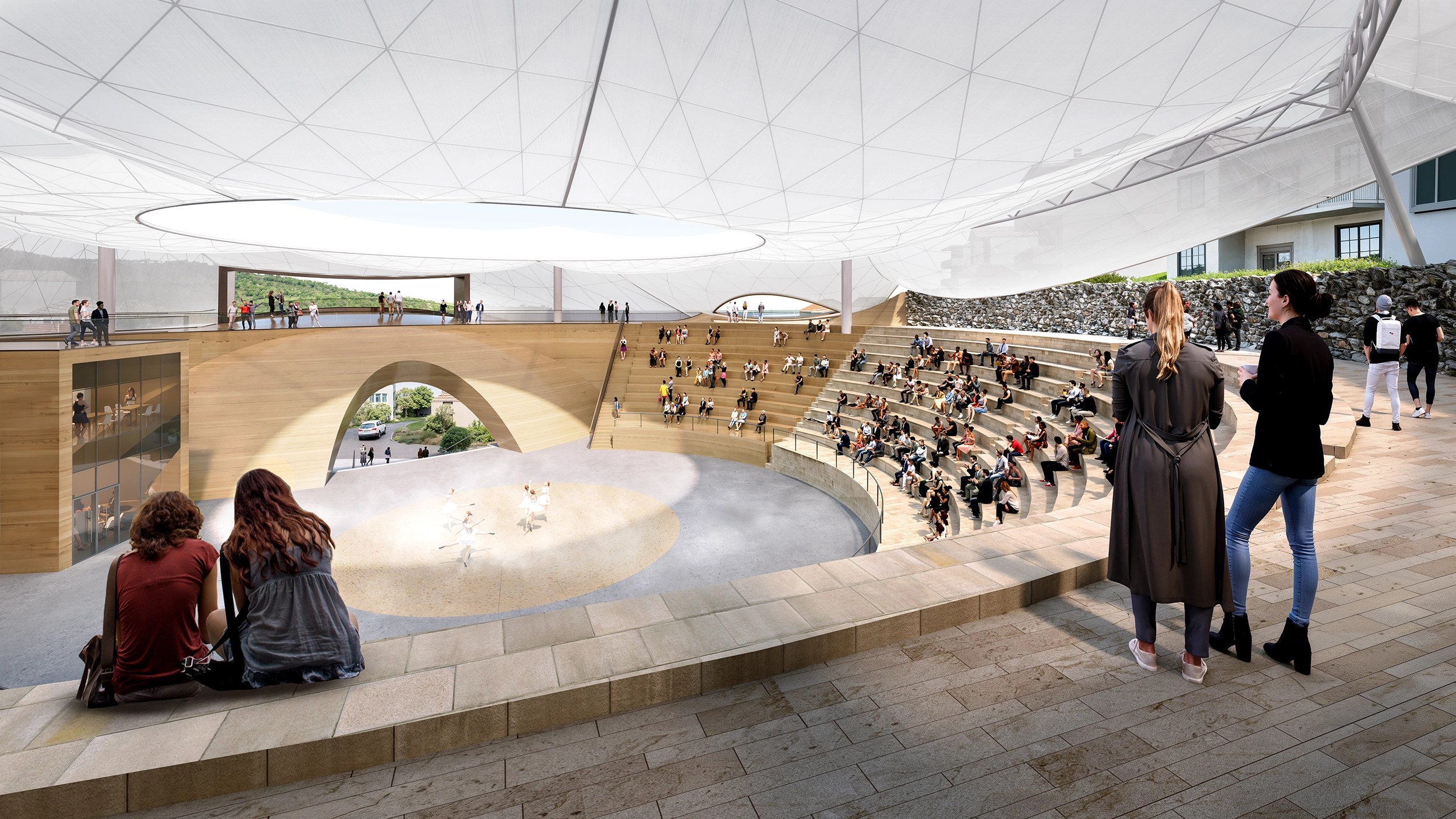 This visual permeability reduces the psychological distance often associated with traditional enclosed theatres and fosters a sense of familiarity and approachability. The amphitheatre no longer reads as an isolated cultural institution, but as a shared civic space that welcomes participation and encourages exploration. As a recognizable yet restrained landmark, the cantilevered canopy attracts attention without overpowering the historic fabric. Its curved profile draws the eye, sparks curiosity, and invites the public to enter, gather, and engage.