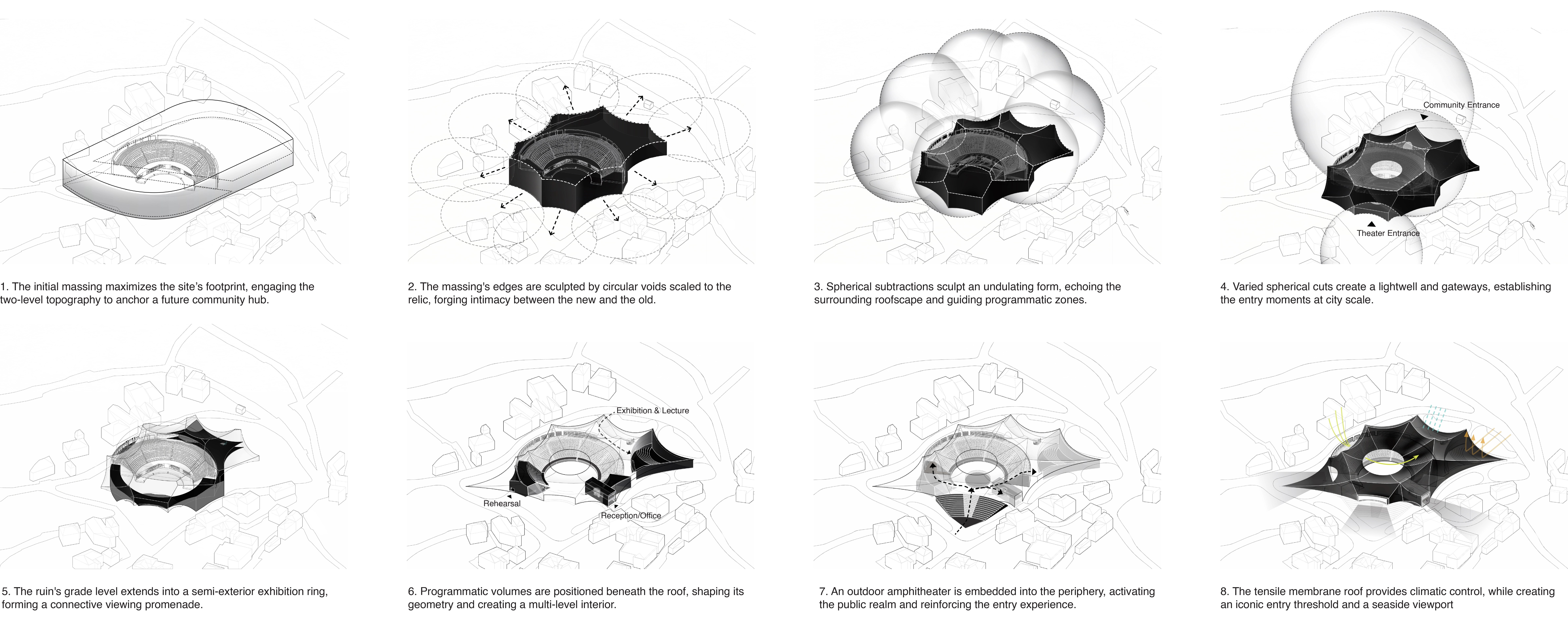 Through minimal intervention and deliberate activation of public life, the project demonstrates how archaeological heritage can be preserved while serving contemporary civic needs. By layering new social spaces beneath and alongside the historic amphitheatre—rather than imposing upon it—the revitalization offers a repeatable model for adaptive reuse that integrates heritage conservation with public accessibility, urban regeneration, and long-term cultural sustainability. The ancient theatre is reclaimed not only as a site of memory, but as a living civic infrastructure reintegrated into the social, cultural, and spatial fabric of the city.