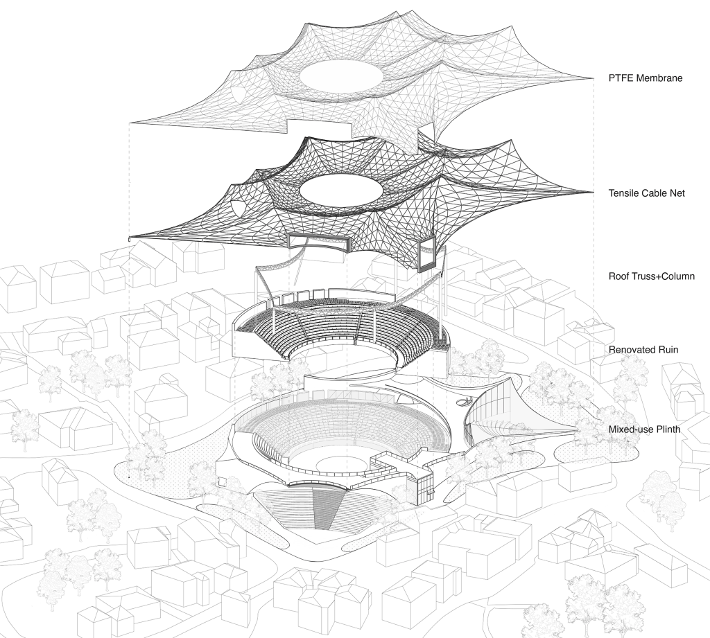 At night, the softly illuminated semi-transparent roof transforms the amphitheatre into a subtle civic lantern, signaling renewed cultural activity while avoiding excessive monumentality. The lightweight presence of the new intervention ensures that the historic amphitheatre remains dominant, while the contemporary structure communicates its role as an active, accessible, and community-oriented public space.