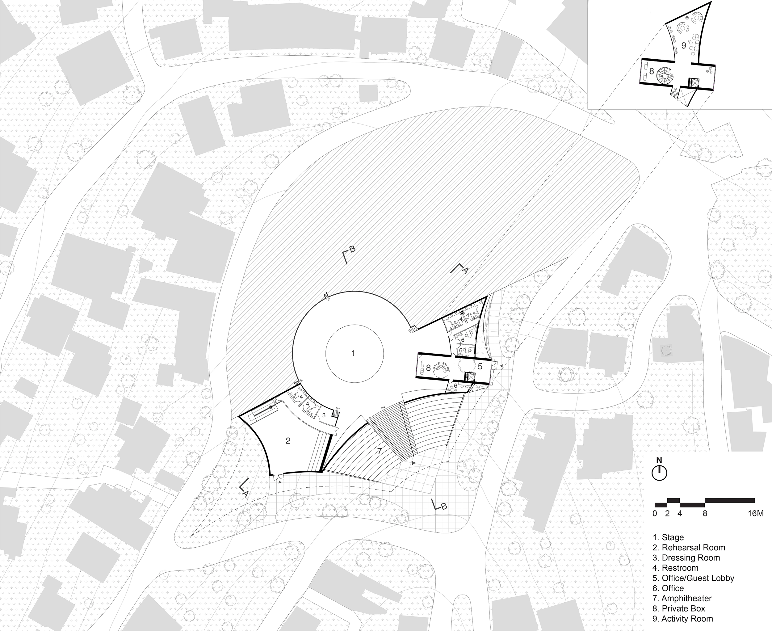 The site is defined by significant topographical variation, with the historic amphitheatre embedded at a higher elevation and surrounded by steep terrain. Rather than reshaping the land or imposing a singular architectural object, the design strategy works precisely with the existing topography, allowing spatial relationships to emerge from the site itself. The original cavea and stage are retained at their elevated position, preserving their role as the spatial, cultural, and symbolic core of the theatre and maintaining the monument’s historical primacy.