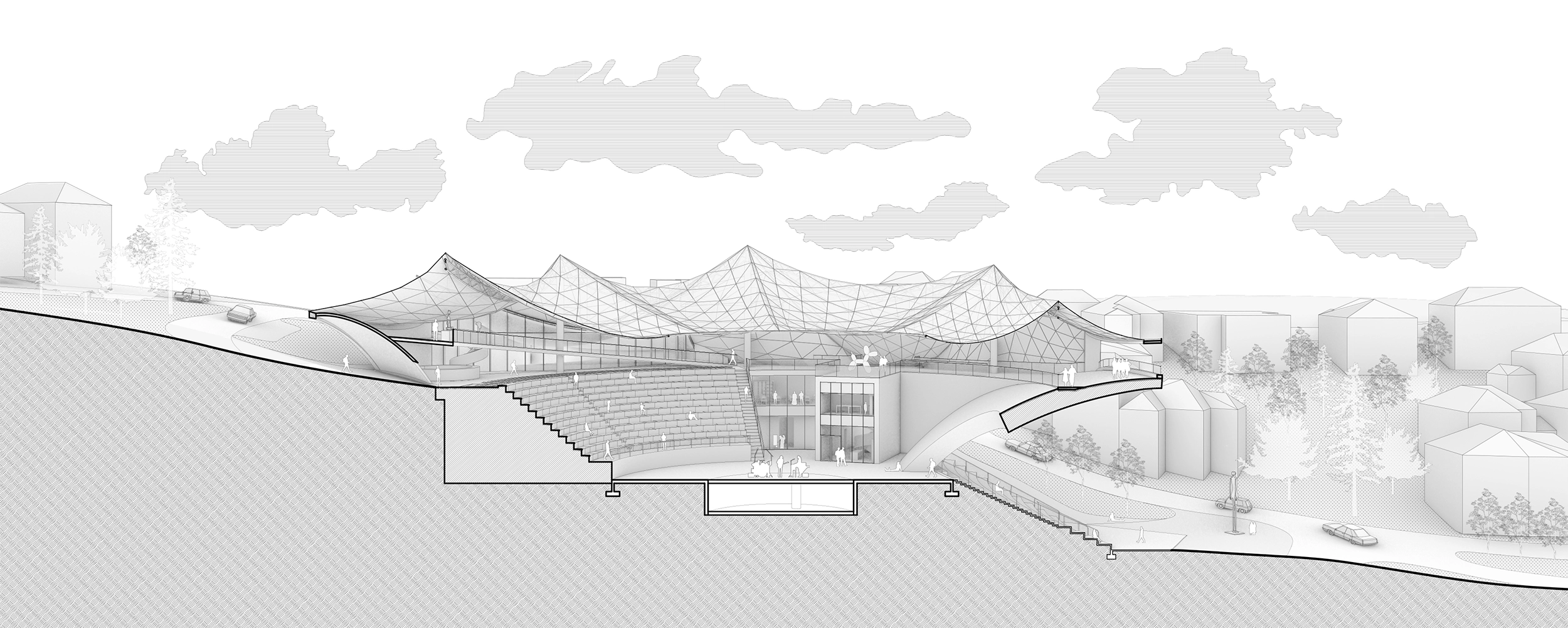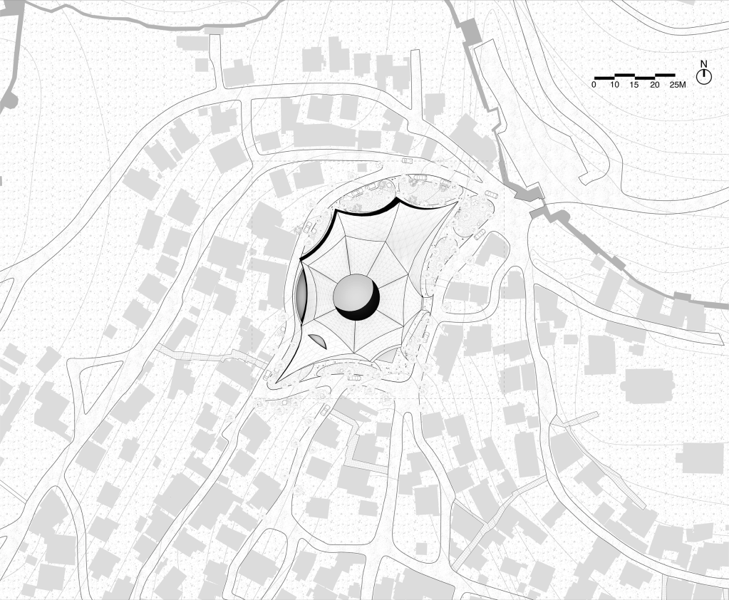 Above the semi-open amphitheatre, a lightweight hemispherical cantilever extends outward to define both the spatial and symbolic center of the intervention. More than a climatic shading device, this suspended form acts as a welcoming architectural gesture, clearly signaling public access and inviting people into the space from the surrounding urban fabric. The cantilever frames the entrance as a generous threshold, guiding movement while offering comfort and protection from the elements.